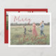 Modern photo Christmas card featuring a simple and minimal design with "Merry Christmas" in an elegant, red rustic script over your favourite picture along with your family name.  The template includes a white overlay to help the text stand out over your photo and may be removed in the design editing tool.  The back has a photo collage consisting of three vertical photos over a cranberry red background.