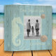Rustic, sea green, weathered boards with light green sea horse motif and tan sand dollars. Photo and text templates are created for you.