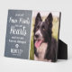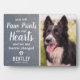 Personalized pet memorial plaque featuring a photo of your beloved pet, a rustic faux grey slate background, and a sympathy quote that reads "you left paw prints on our hearts and we are forever changed", a paw print, heart, your dogs name, and the dates. A wonderful keepsake and tribute of your precious family pet dog or cat.