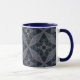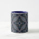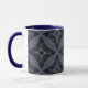 With the rich tones of aged wood, stone, and weathered rooftops, this mug features a kaleidoscopic starburst pattern made from architectural textures. Muted browns, deep greens, slate greys, and sky blues form a rustic yet structured mandala that feels both handcrafted and geometric. The deep navy interior and handle create a calming contrast, perfect for quiet mornings, cozy cabins, or those who love natural textures and symmetry.