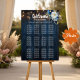 An elegant Wedding design with elegant calligraphy completed by wonderful blue wood, garden string lights and white blue floral with gold glitter that can be personalized with your Wedding Guest Names. This Board is for 12 Table Guests.
