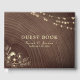 Élégant livre d'hôtes de style rustique avec arrière - plan en faux bois, lumières à cordes brillantes et oeuvres d'art florales en or. Personnalisé avec les noms et la date du couple, parfait pour accueillir vos invités dans le style.