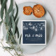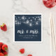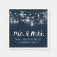 Affordable custom printed paper napkins for your wedding or any event. The design features rustic glowing string lights and mason jars hanging across the top with a mix of modern and calligraphy script fonts on a navy blue background. Personalize it with your Mr. and Mrs. monogram and wedding date or other custom text. Use the design tools to choose any background colour, edit the text fonts and colours or upload your own photos.
