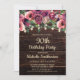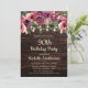 90th birthday party country-style invitation for women with a rustic dark brown barn wood background with twinkling string lights, and pink and purple watercolor floral. The text on this invitation is fully customizable, so regardless of the age, it can be personalized perfectly. Contact us for help with customization or matching products.