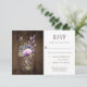Rustic RSVPs featuring a mason jar filled with violet, purple, and lavender wildflowers with baby's breath and greenery and adorned with a purple ribbon. The back of the card features white string lights with a pale violet mason jar over a weathered barn wood background. If you would like this design on a matching product, or need help, please contact me through my store.