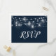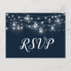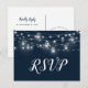 Affordable custom printed wedding RSVP postcards with an easy to use template for customization. This rustic chic design features strands of glowing string lights and mason jars on a dark navy blue background. Personalize the template with your wedding reply details - including meal options if needed - or customize the text to use for any event. Use the design tools to choose any background colour, add photos and customize the text fonts and colours to make a unique design for your wedding.