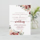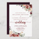 Ce faire-part de mariage de calligraphie florale d'été rustique est parfait pour un mariage moderne. Le design est composé de fleurs d'aquarelle bordeaux, roses et rousses avec des feuilles verts dans un arrière - plan verni brun.
