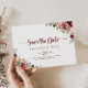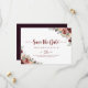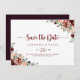 This rustic summer floral horizontal wedding save the date is perfect for a modern wedding. The design features burgundy, pink and blush watercolor flowers with green leaves in a brownish stained background.
