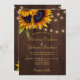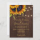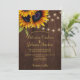 Elegant chic summer or fall printable wedding stylish invitation template on brown barn wood featuring a beautiful sunflowers bouquet and strings or twinkle lights. +++++++++ The invitation is suitable for elegant summer or autumn fall rustic country garden barn outdoor or backyard weddings. digital download available