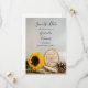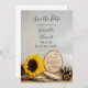 Personalize the informal and elegant Rustic Sunflower Woodland Wedding Save the Date Announcements with the names of the bride and groom and specific marriage ceremony date. This natural custom outdoors theme woods or forest inspo wedding keep the date announcement features a quaint nature style photograph of a yellow sunflower blossom, wood slices with the word LOVE on it, two brown pine cones and white bridal veil with a burlap and white satin background.