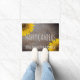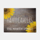 Country rustic floral home decor gift for rvers, retired travelers, gardeners, hikers, campers, and nature lovers is this personalized wood texture doormat that reads- 'Happy Campers' in simple lettering with a template for adding family name below in white, whimsical letters. Against a background photo of rustic, distressed wood that is scarred and darkened around the edges. Country yellow sunflowers decorate opposite corners. Pretty retirement gift, too, and floral autumn decor. Would be right at home in front of an RV or cozy log cabin.