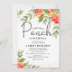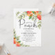 Rustic boho peach theme gender neutral baby shower invitation card. Design features watercolor illustrations of the garden fruit peaches, greenery and faux gold heart confetti on a classic white background. The elegant template is easy to customize with your own baby shower details. Perfect for a baby shower in the summer!
