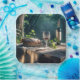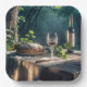 A rustic wooden table set in a serene forest clearing holds a bottle of wine, a glass, and a freshly baked loaf of bread