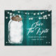 Romantic rustic teal wedding save the date postcard featuring a mason jar and two burlap hearts against a rustic wood background adorned with string lights.