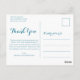 This rustic country design features pale gold white string lights and lace along with yellow sunflowers and sprigs of baby's breath against a teal barn wood background. The customizable text appears in pale gold white on the front in popular script and serif typography. The text on the back is a matching teal. You can personalize this thank you postcard for your own wedding by changing the text in the template.
