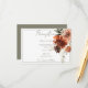 This modern yet rustic wedding reception card design features a corner bouquet of peach blush, rust, terracotta, brown and white flowers. The background is white with a sage green thin frame; the back is a soft sage green. This design is part of the Rustic Terracotta Rust Flowers Wedding Suite of cards created by Simply Farmhouse Press.
