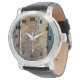 A watch with a cool looking rustic texture as a background. Vertical stripes of red yellow and green paint flaking and peeling off a rusted old metal wall. Looks old and weathered with an urban grunge style.