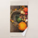 Towel set with a photograph of a thanksgiving harvest, set on a rustic wooden table. Pumpkin, potatoes, squash etc... make up this bountiful collection of food. Colourful autumn leaves surround the cornucopia basket.