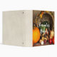 A binder with a photograph of a thanksgiving harvest, set on a rustic wooden table. Pumpkin, potatoes, squash etc... make up this bountiful collection of food. Colourful autumn leaves surround the cornucopia basket.