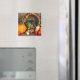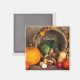 A magnet with a photograph of a thanksgiving harvest, set on a rustic wooden table. Pumpkin, potatoes, squash etc... make up this bountiful collection of food. Colourful autumn leaves surround the cornucopia basket.