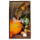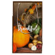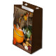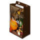 A gift bag with a photograph of a thanksgiving harvest, set on a rustic wooden table. Pumpkin, potatoes, squash etc... make up this bountiful collection of food. Colourful autumn leaves surround the cornucopia basket.