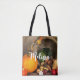 A tote bag with a photograph of a thanksgiving harvest, set on a rustic wooden table. Pumpkin, potatoes, squash etc... make up this bountiful collection of food. Colourful autumn leaves surround the cornucopia basket.