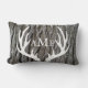 Grey tree bark background with white deer antlers silhouette and your choice of monogram text on front and back! This lumbar pillow makes an excellent gift or accent for that cozy home tucked away in a beautiful woodland setting!
