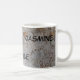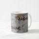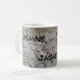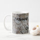 This morning coffee or tea mug features a rustic photo of a beautiful pattern found on a tree trunk. This tree bark features an abstract pattern of white, golden brown, and grey. Earth tone swirls and dots add interest to the textured white background. Your name is repeated three times on the mug and can easily be personalized.
