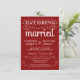 Eat, Drink, and be Married -- Vintage style rustic country wedding invitations -- Swirly, curly scrolls and old-fashion typography on deep cherry apple burgundy red background. Add your names and wedding info in this easy to use template. Elegant but fun and whimsical, chalkboard style script writing can be modified for your formal or semi-formal retro wedding theme. Casual modern style is perfect for trendy contemporary weddings with a fun touch of sophisticated charm for the traditional bride and groom. Please contact us for help with customization if you need additional room for your wedding details. Other sizes and chalkboard styles available.