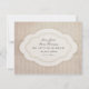 This save the date card features a striped cream background on which a darker cream ribbon bears a white emblem with scalloped edges. This curved, symmetrical form, which looks like a paper cut-out, frames the words "Save the Date!" with a swirly script flourish on the front, and a few simple wedding details (customizable!) written in classic script and Garamond fonts on the back. The design has a distressed, vintage, aged feel which complements the theme of simple, old-fashioned elegance.