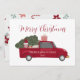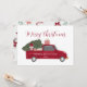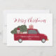 Rustic vintage red truck hauling a christmas tree. Holiday greeting card with festive typography that you can personalize with your family name and year. With cute santa gnome and gifts. A true keepsake!