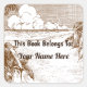 A custom bookplate with script and retro letters and a rustic etching of tropical palm trees in dark brown.