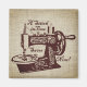 Vintage tinted hand crank sewing machine illustration with "A stitch in time saves nine" text on light burlap