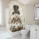 This watercolor-style winter scene makes a charming and rustic statement for a shower curtain. At its heart stands a classic snowman with a carrot nose, coal smile, and twig arms, dressed in a weathered brown scarf and a tall black top hat adorned with pinecones, holly, and twigs—evoking a homespun, woodland elegance. Two birds perch nearby, one playfully wearing a tiny hat, nestled among snowy pine branches and chopped logs. The softly falling snow and muted forest backdrop add a peaceful, cabin-in-the-woods atmosphere, perfect for bringing cozy, rustic charm to your bathroom decor.