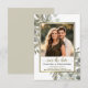These beautiful save the date cards will let your friends and family know about your upcoming wedding. They feature a rustic sage green and gold design with your photo surrounded by hand painted sprigs of eucalyptus leaves and pine branches. The title is written in lacy script calligraphy with room for the names of the couple, the wedding date, location, and website.