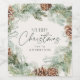 Elegant and rustic holiday wine labels featuring a watercolor wreath of pinecones, pine boughs, and lush greenery with a light cream background. "Merry Christmas" is displayed in a dark green script with your name shown below.