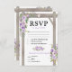 Elegant wedding response cards featuring a classy chic white background that can be changed to any colour, a stylish purple & lavender watercolor floral display on a rustic wooden wedding arch, a carved heart with the couples initials, and a simple wedding rsvp template with a menu option.