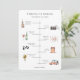 Rustic colourful watercolor wedding day elements, timeline program. Card features church, camera, bottle with glass, plate setting, music notes, cake, sunflower bouquet, and retro car. Back of card features solid navy blue colour . Text font style and colour can be customized.