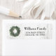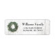 These rustic holiday address labels feature a festive laurel wreath on the left a top a white and grey weathered wood background. On the right is your name and address in black typography which may be personalized. Designed by artist © Susan Coffey.