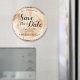The magnet features a printed wood grain cut slab disc, creating the illusion of a beautiful wooden surface. This design element adds a touch of natural elegance to your Save the Date announcement, perfectly capturing the essence of your rustic wedding theme.