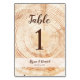 The design of the table numbers features a printed wood tree ring background, reminiscent of the natural beauty of rustic settings. The brown typography stands out against the wood grain, ensuring that the numbers are easily visible and readable.