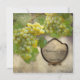 NOTE: USE THE RSVP MARKED "SQUARE SIZE" TO FIT IN THE ENVELOPES. Square Paper Invitation Card illustration design which is ideal for Summer, Autumn or Fall Rustic Vineyard outdoor wine country style weddings at a winery or farm venue location. White wine grapes, Chardonnay variety, are hanging from the vine on the trellis' at a vineyard. the background is an aged, distressed vintage stone or wooden fence board. Rich autumn fall colours are beginning to show in the leaves and the grapes. The image was hand painted in mixed media by Audrey Jeanne.