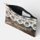 Delightfully rustic western style cosmetic and toiletry bag has a dark tooled leather background and a faux antique lace panel with a row of applied pearls. Personalize it with the easy to use template provided. The font is completely customizable should you want to use a different style type face. Available in small and large sizes.