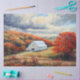 Charming rural landscape featuring a white barn amidst colourful autumn foliage.
