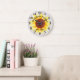 Large beautiful rustic white barn vintage wood sunflower personalized family name year established wall decor clock. The perfect country wooden plank floral look for any home or kitchen.