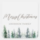 Custom-designed holiday gift stickers featuring rustic watercolor pine trees design with personalized family name on white background.
