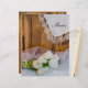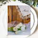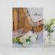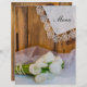 The charming Rustic White Tulips Country Wedding Menu can be personalized with the details of the meal that you will serve at your March, April or May spring time bridal shower luncheon, marriage reception dinner or post wedding brunch. This casual yet classy custom western ranch theme nuptial menu features a quaint floral photograph of a bouquet of white tulip flower blossoms, white pearl necklace, bridal veil and a vintage lace trimmed linen handkerchief with a brown barn wood background.