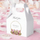 This design features a rustic wild flower bouquet. A simple gold circle frame encircles the text. The rustic pink floral colour tones compliment the greenery of the leaves. The gold tones tie everything together to create a rustic country woodland garden feel. Elegant wedding favour box design with modern elements. Matching wedding invitations and other stationery items are also available.