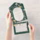 ALSO AVAILABLE WITH A QR CODE, WITH TWO DINNER OPTIONS OR WITHOUT DINNER OPTIONS. This design features a soft wildflower frame around a cream oval on an emerald green background. Personalized All-In-One invitations are a unique combination of both a beautifully printed custom invitation with an easy to tear off perforated RSVP postcard. And they are so easy to use! You simply fold, then seal the back flap with the three included clear stickers, and mail. And when your guests receive your custom invite, they just tear the perforated RSVP Card off and drop it back in the mail to you!