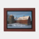 Personalize the charming Rustic Wintery Barn Happy Holidays Doormat with your family name. This rustic chic custom country Christmas welcome mat features a digitally painted farm photograph of a rustic red wooden barn and silo covered with white winter snow.
